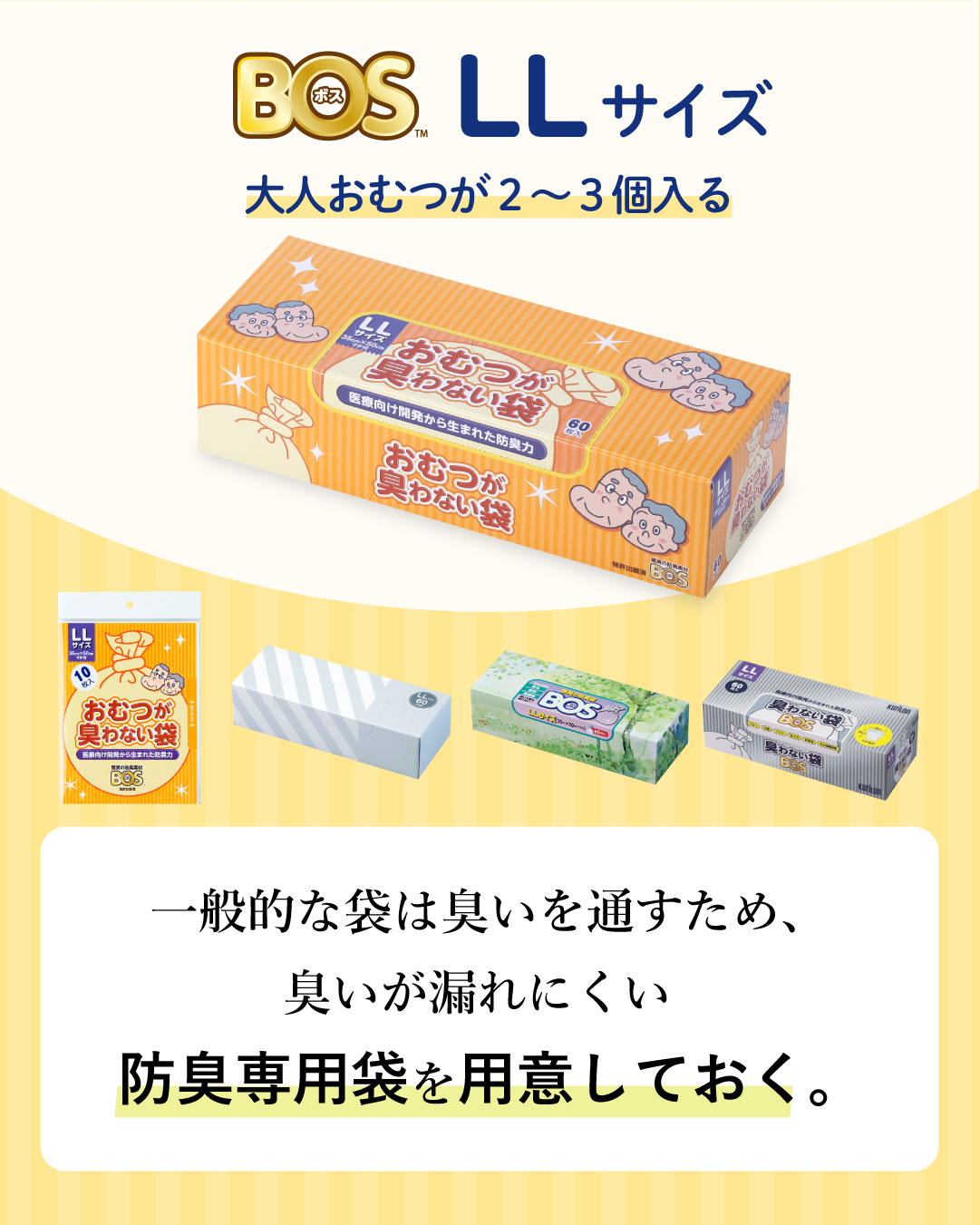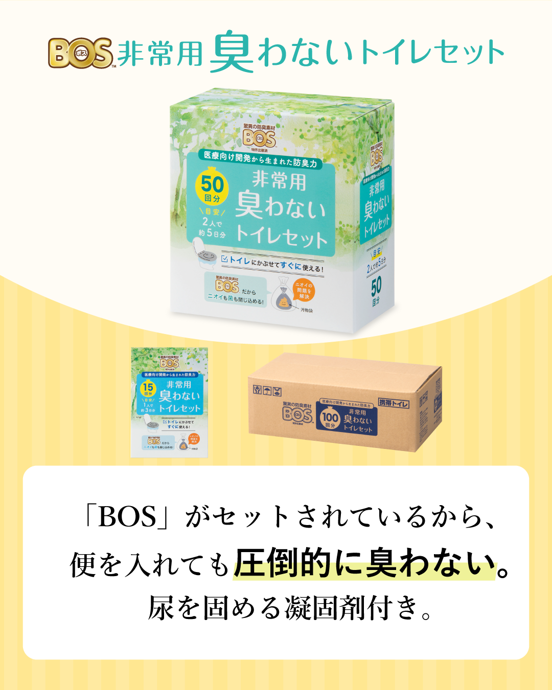 「BOS」が入ったトイレセットで、便を入れても圧倒的に臭わず、尿を固める凝固剤も付いています。